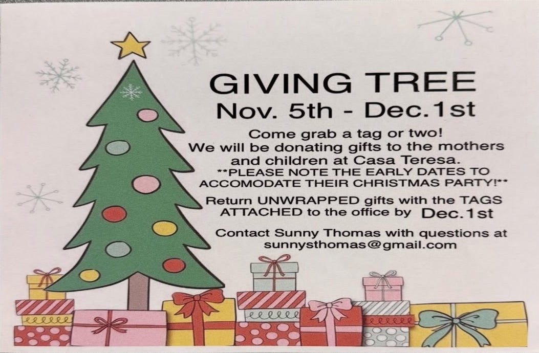 The Giving Tree is up in the office! Come by and grab a tag or two for families at Casa Teresa and return an unwrapped gift to the office by December 1st.
